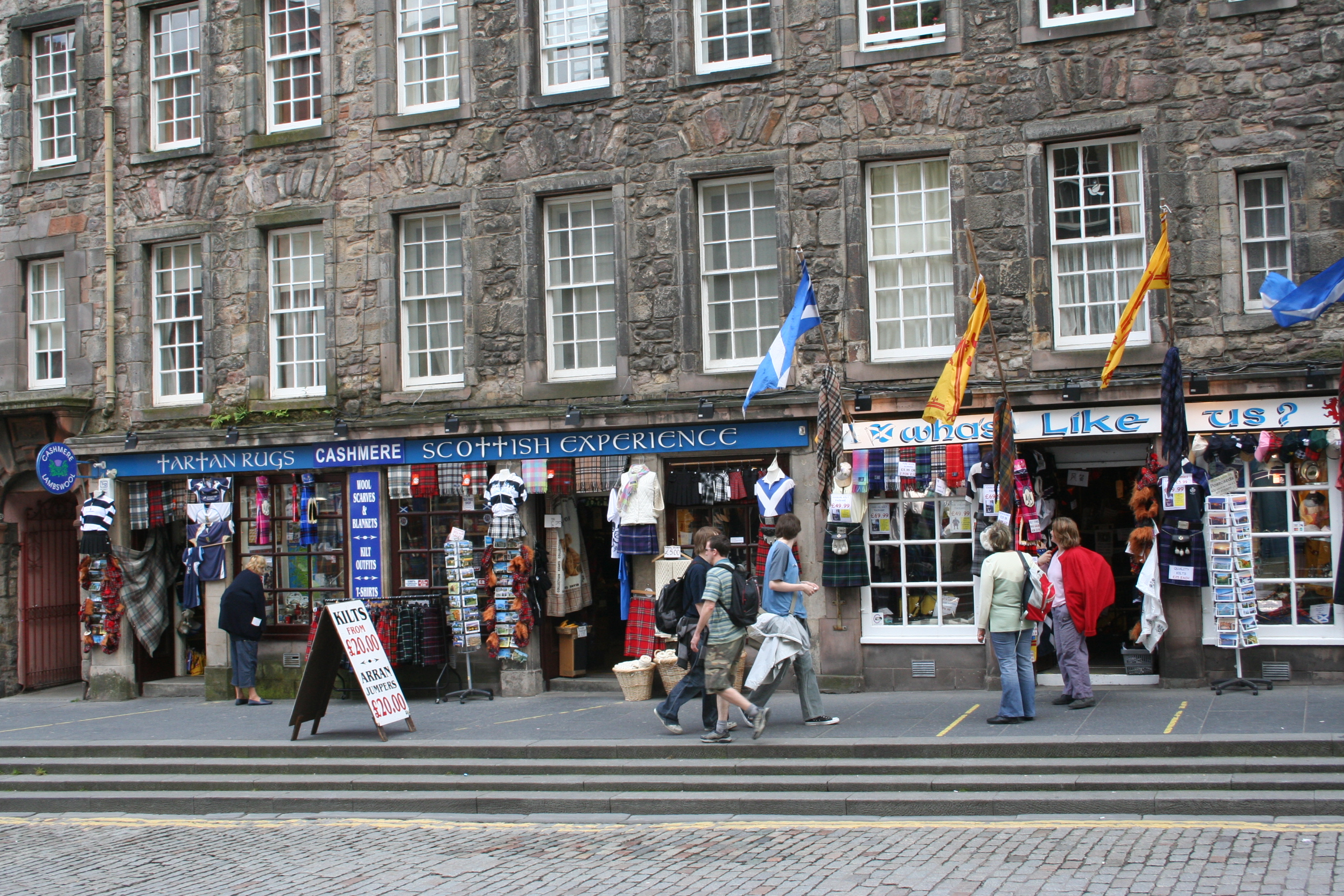 We made our way to High Street, also known as “The Royal Mile” (due to the fact that it connects Edinburgh Castle and Holyrood Palace). The Royal Mile today is quite the tourist mecca, but in spite of that I thought it was great. There are an abundance of shops, each selling the usual “must have” items. The chief item here being tartan; anything that could conceivably be made out of tartan was covered: there were kilts (of course), and scarves, and ties, and blankets, to name a few of the goods that we saw. Some of the shops had bagpipe music cheerfully filtering through so that passers by would know in no uncertain terms that Scotland was being represented here.