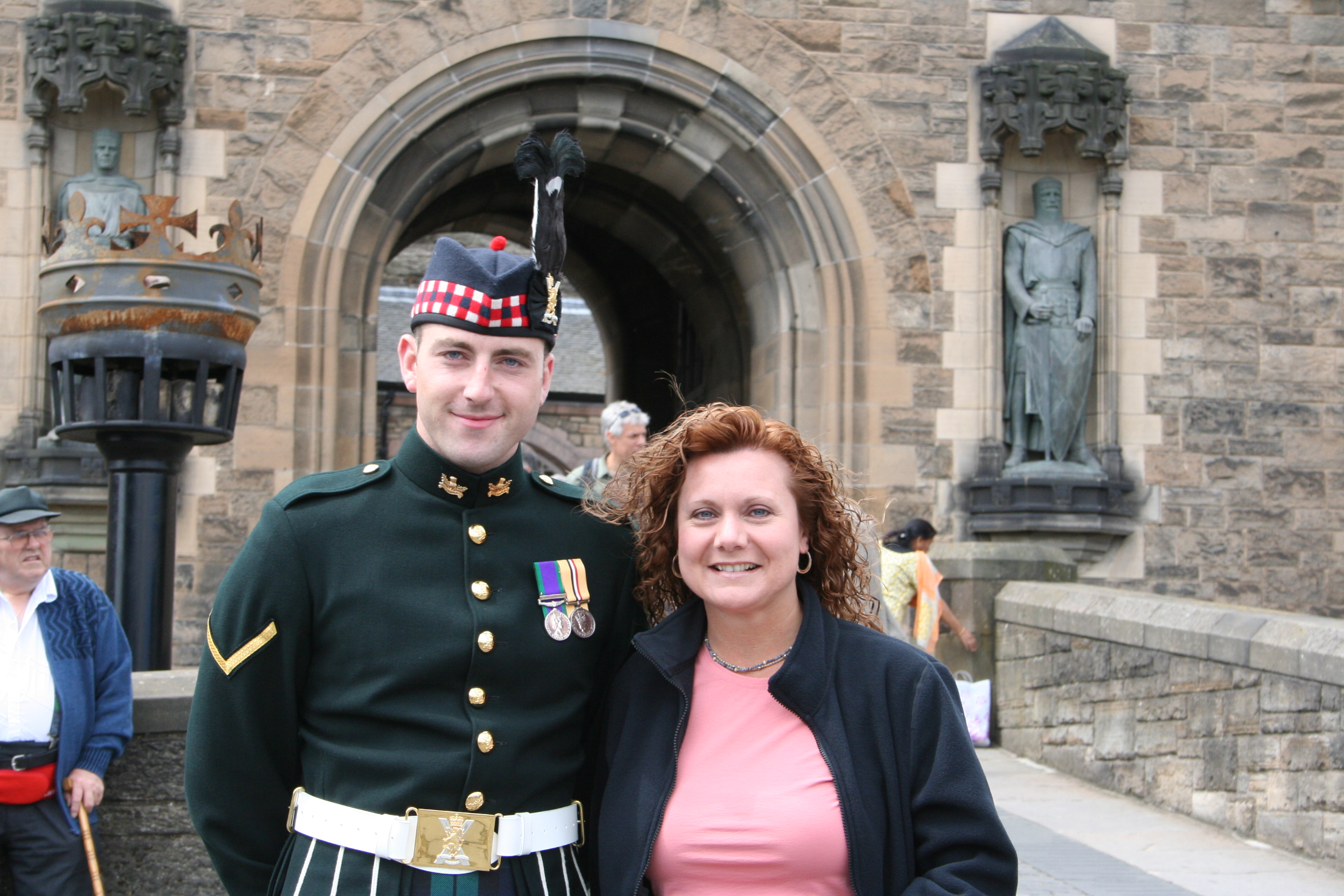 We passed through the temporary stadium that is set up yearly in the esplanade of the castle. Every year, during the Festival in August, the Royal Military Tattoo performs here. Now, in June, it was a flurry of construction. As we approached the castle, we notice the kilted guards standing at attention. One of them obviously had “picture duty”. I did my job as a tourist and posed for a snapshot with him. We made our way past the statues of Robert the Bruce and William Wallace that were guarding the entryway, and began our tour.
