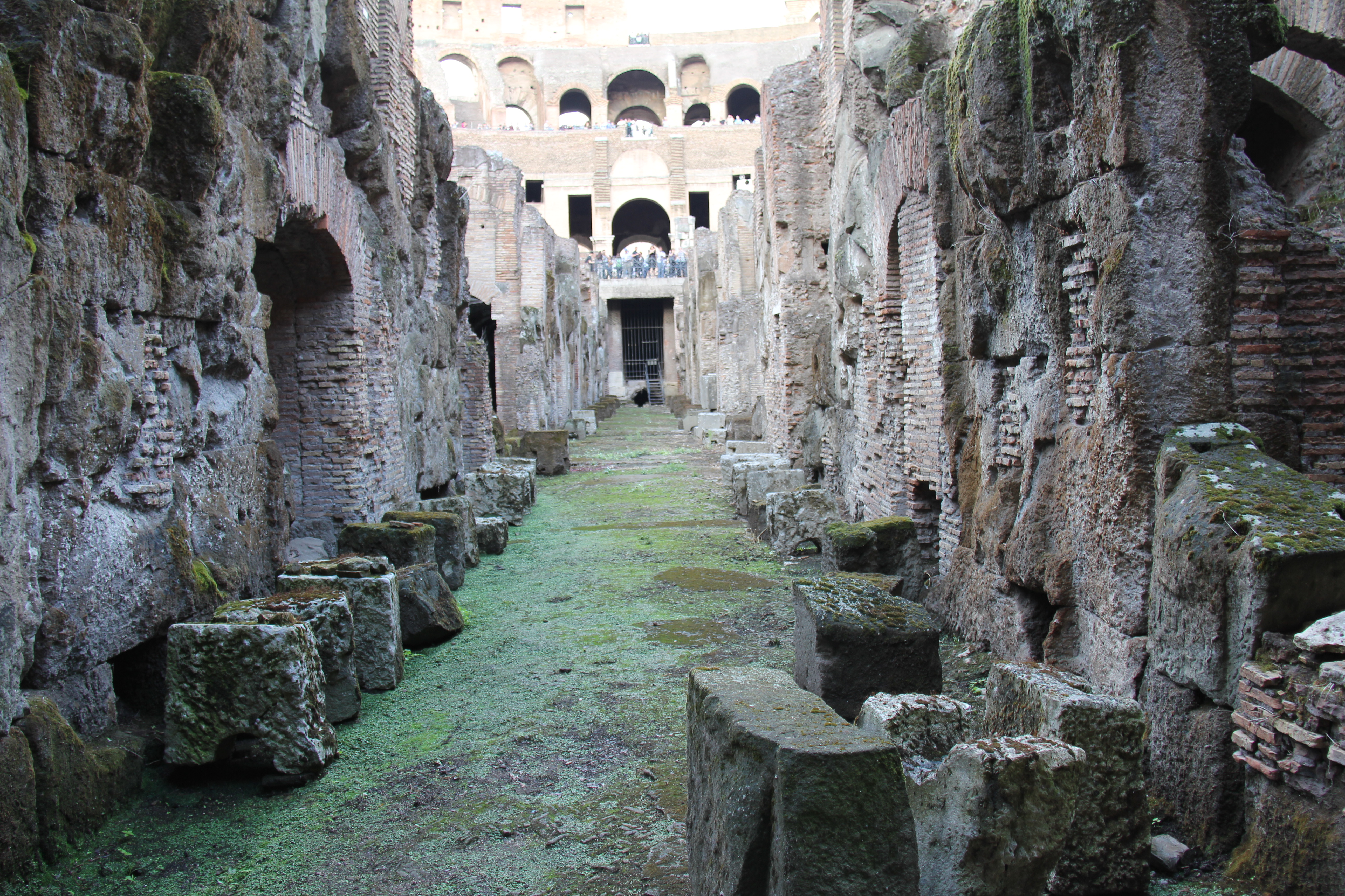 The wooden floor would have originally been covered with sand, the Latin word for sand being harena or arena. Beneath the floor, as our tour guide explained, there had originally been a vast underground area known as the hypogeum, which consisted of a warren of tunnels and passages. The hypogeum was essentially the area that supported the “behind the scenes” aspect of the “games” that took place here: there were cages for the animals, holding cells for the gladiators awaiting their fates, and even a vast elevator-like system for bringing both to the arena. Evidence also suggests hydraulic mechanisms existed, which allowed for the arena floor to be flooded in the event that a naval battle was reenacted.