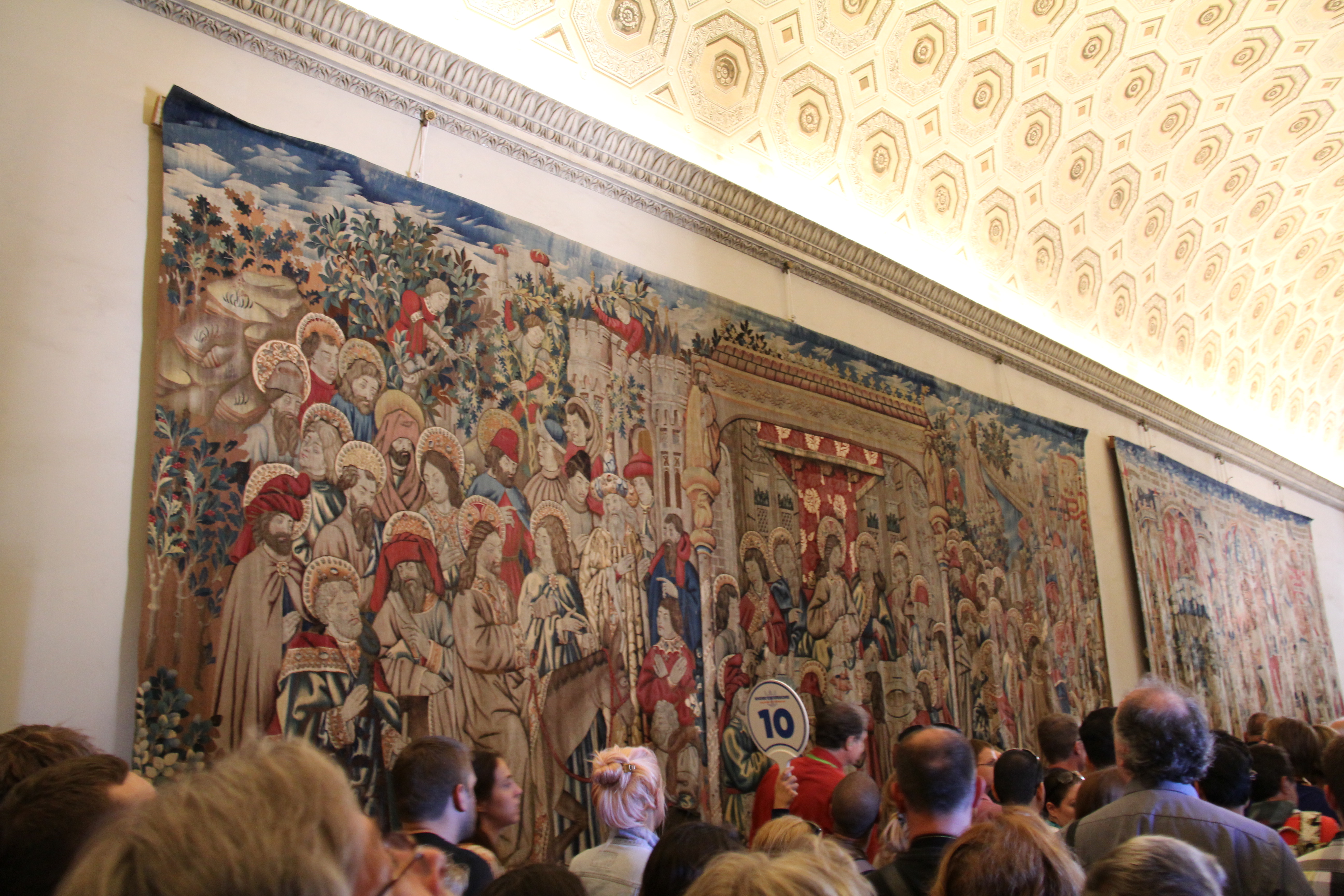 The closer we got to the Sistine Chapel, the more crowded it became. And hot. It was surprising to me that in a place with so much priceless art, that there wasn’t better climate control. It was almost unbearable. At some point, as we were walking down a staircase, in the jostling of the crowd I accidentally missed a step and did something terrible to my back. Two days hence, on a train to Florence, I would pay a price for this clumsiness. Eventually we were herded into the tapestry hallway, where we were jammed in like sardines. As I was pushed and shoved like a pinball, I wondered a few times if this crowd was within the fire code limits, and what, in fact, would happen to us all if there *was* a fire. If you’re claustrophobic at all, you might want to avoid the Vatican.