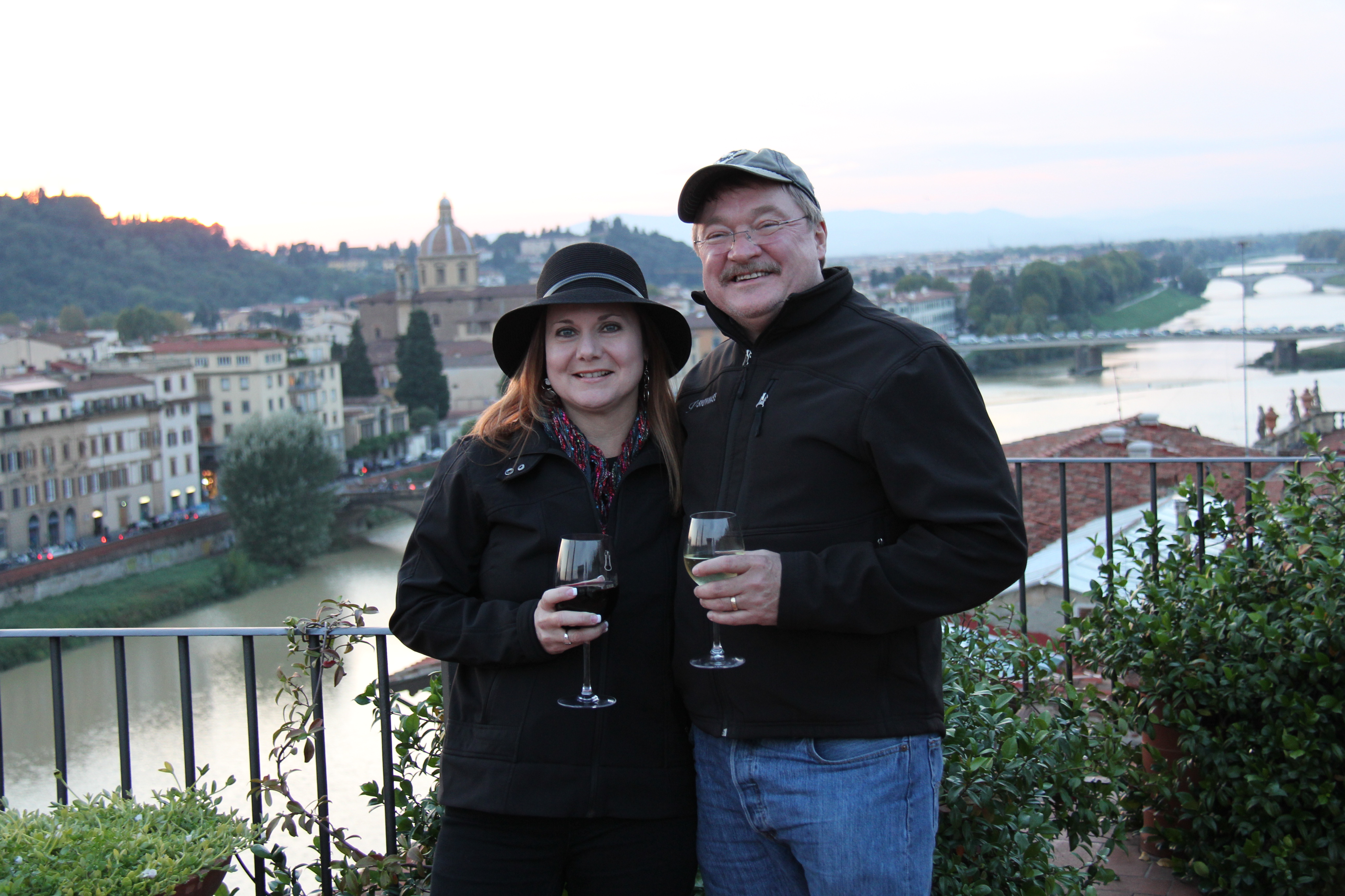 After our tour ended we found our way back to our hotel, and discovered the beautiful rooftop terrace there. The night was lovely – cool and clear, and so we decided to slow down for the night and enjoy some wine outside. We were there around sunset, and were able to get some great photos of Florence. Day one in Florence had been a blast!