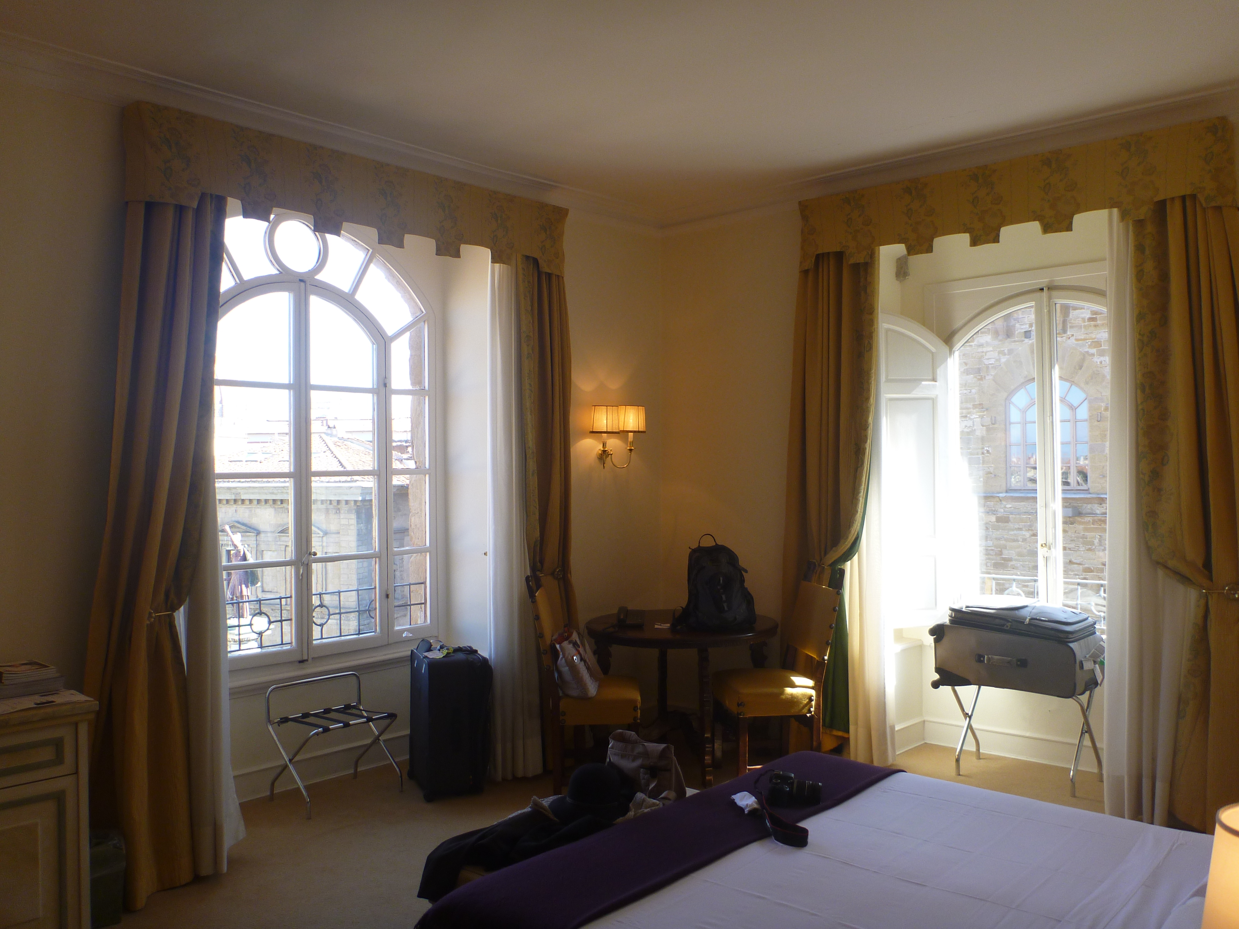 It was a gorgeous day, with the bluest sky I’d seen in many days. Our taxi driver got us easily to our hotel, the “Antica Torre Di Via Tornabuoni”. It turns out that this hotel is rated highly on Trip Adviser for a lot of good reasons. It’s a beautiful hotel, in a fabulous location. We were stunned and thrilled with our beautiful room, with its sweeping views of the city. Throwing open our windows, we thanked our Select Italy travel agent, Maria, yet again, for doing such a great job planning our vacation.