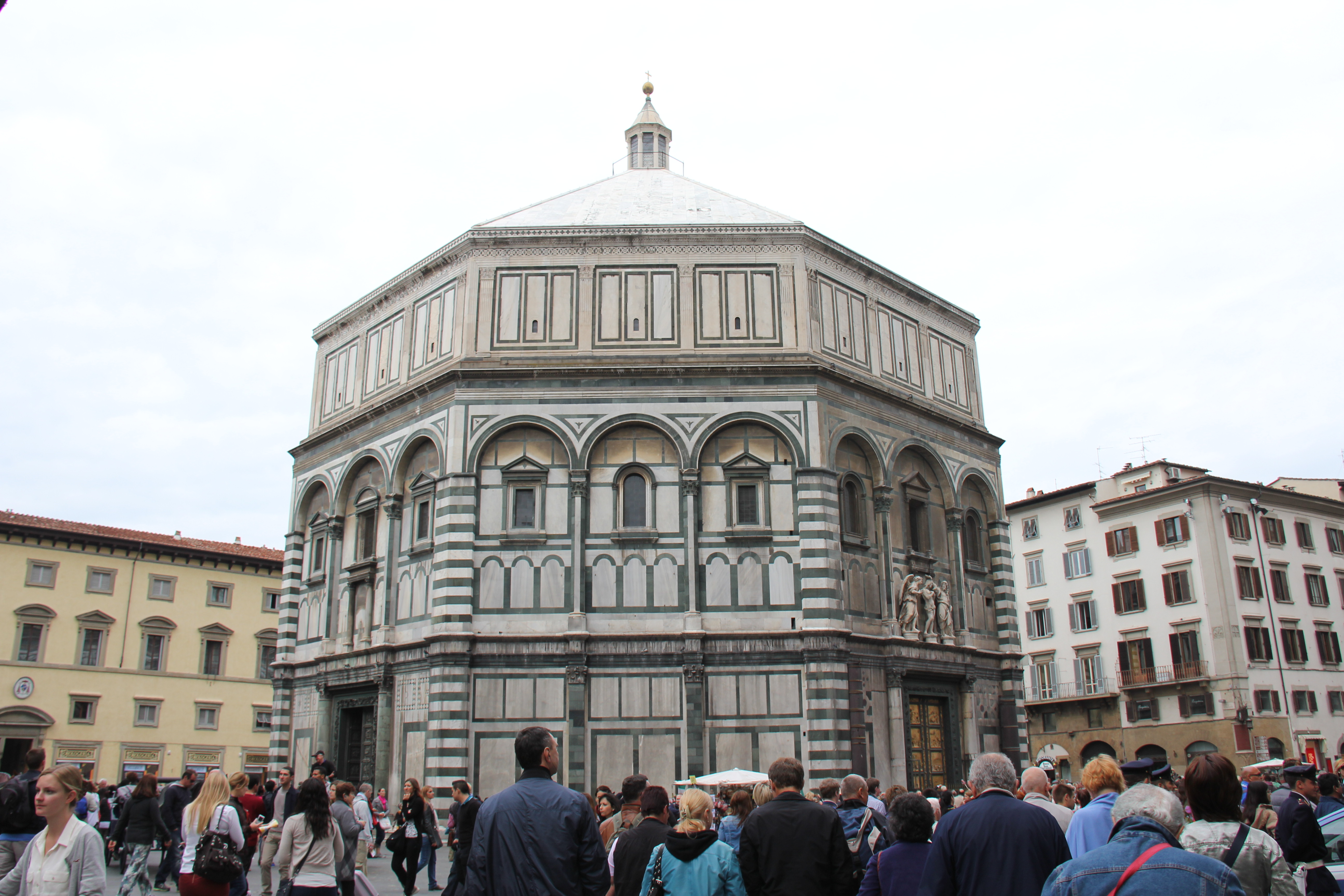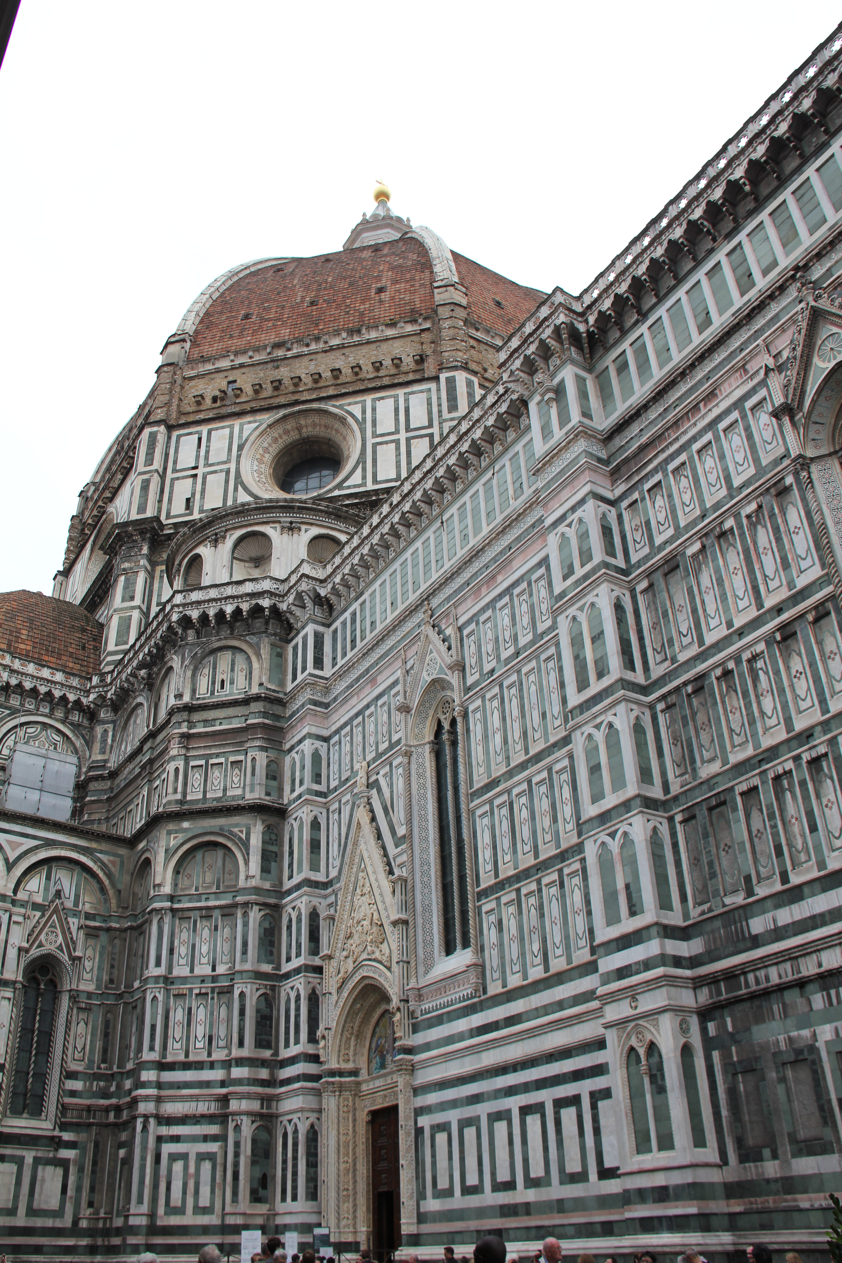 Leaving the museum, we headed for the beautiful and iconic cathedral of Florence, the Basilica di Santa Maria del Fiore, or “Basilica of St. Mary of the Flower” in English, or simply “Il Duomo”, if you are in Florence. This is a truly glorious structure. It was begun in 1296, and completed in 1436. It’s so large that I really couldn’t get any great photos of it in its entirety. (You can see the tips of people’s heads in the photo below, to get a sense of the scale.)