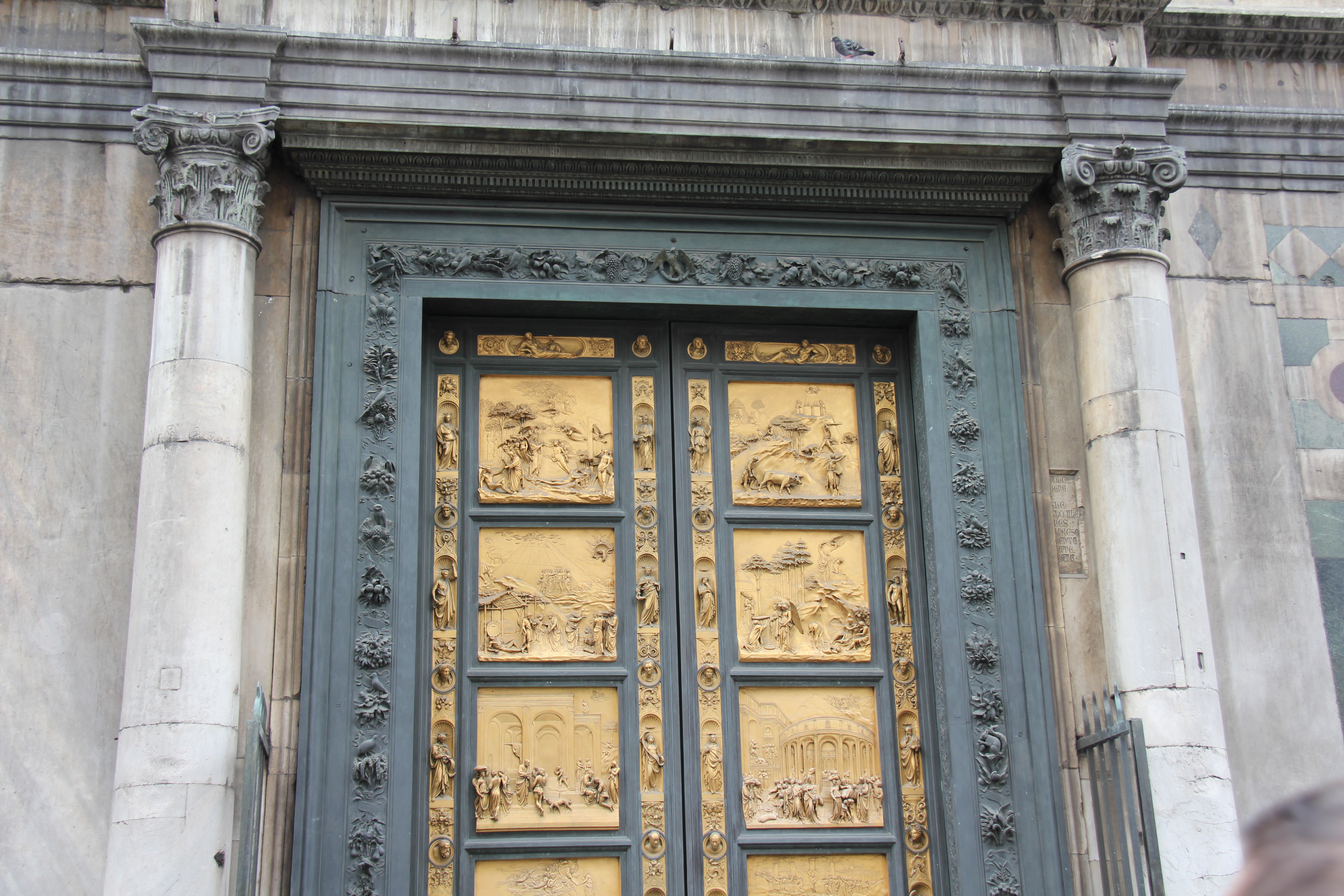 The photos below show the baptistry, a separate structure. The baptistry is one of the oldest buildings in the city of Florence, constructed between 1059 and 1128. Of special interest are the bronze doors depicting various biblical themes. The east doors were named “The Gates of Paradise” by Michelangelo. As beautiful as these are to look at, they are not the original bronze doors. The story that we heard from Angela, our tour guide, was that at some point in Florence’s history, there was a major flood in the city, which actually washed away some of the priceless panels on the doors. The originals are now safely preserved within the Duomo museum.