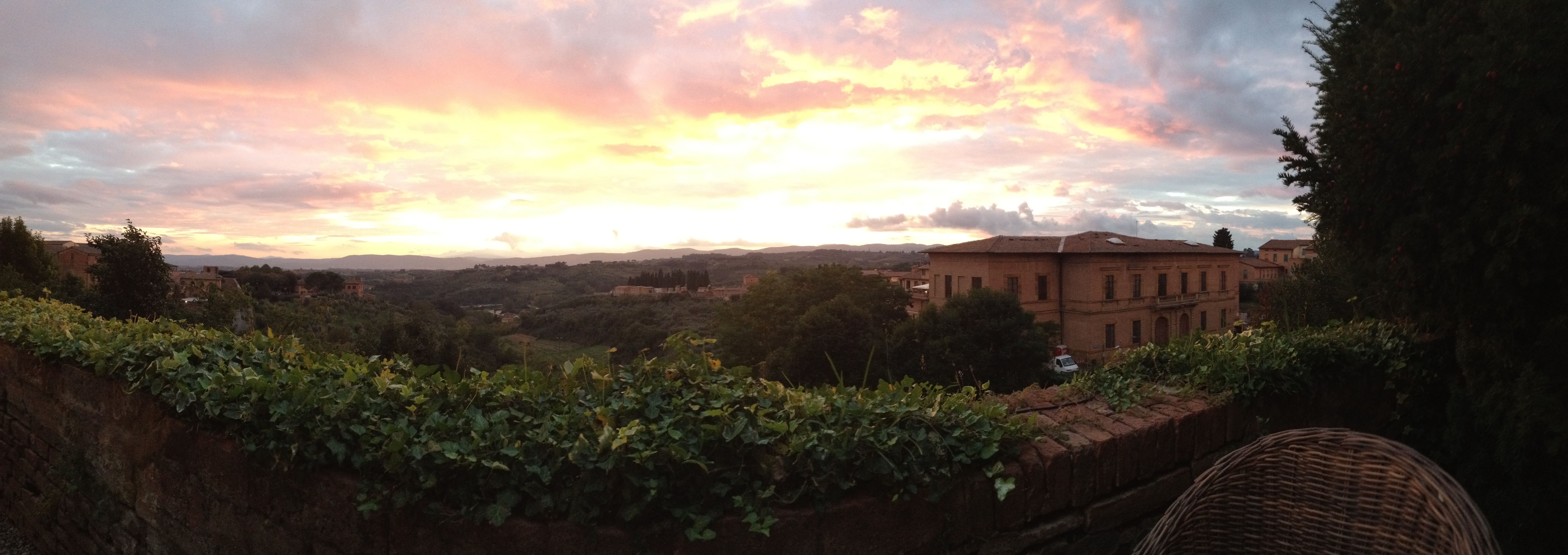 We wanted to make sure that we got back to Siena before dark, given the driving experience (debacle) that we’d had a couple of days before, so we said goodbye to Montepulciano and steered the car back to Siena. We made it home with no trouble this time, and with perfect timing. As we settled in to comfortable chairs on the garden patio of our hotel, which overlooked the valley, we were treated to a spectacular sunset.