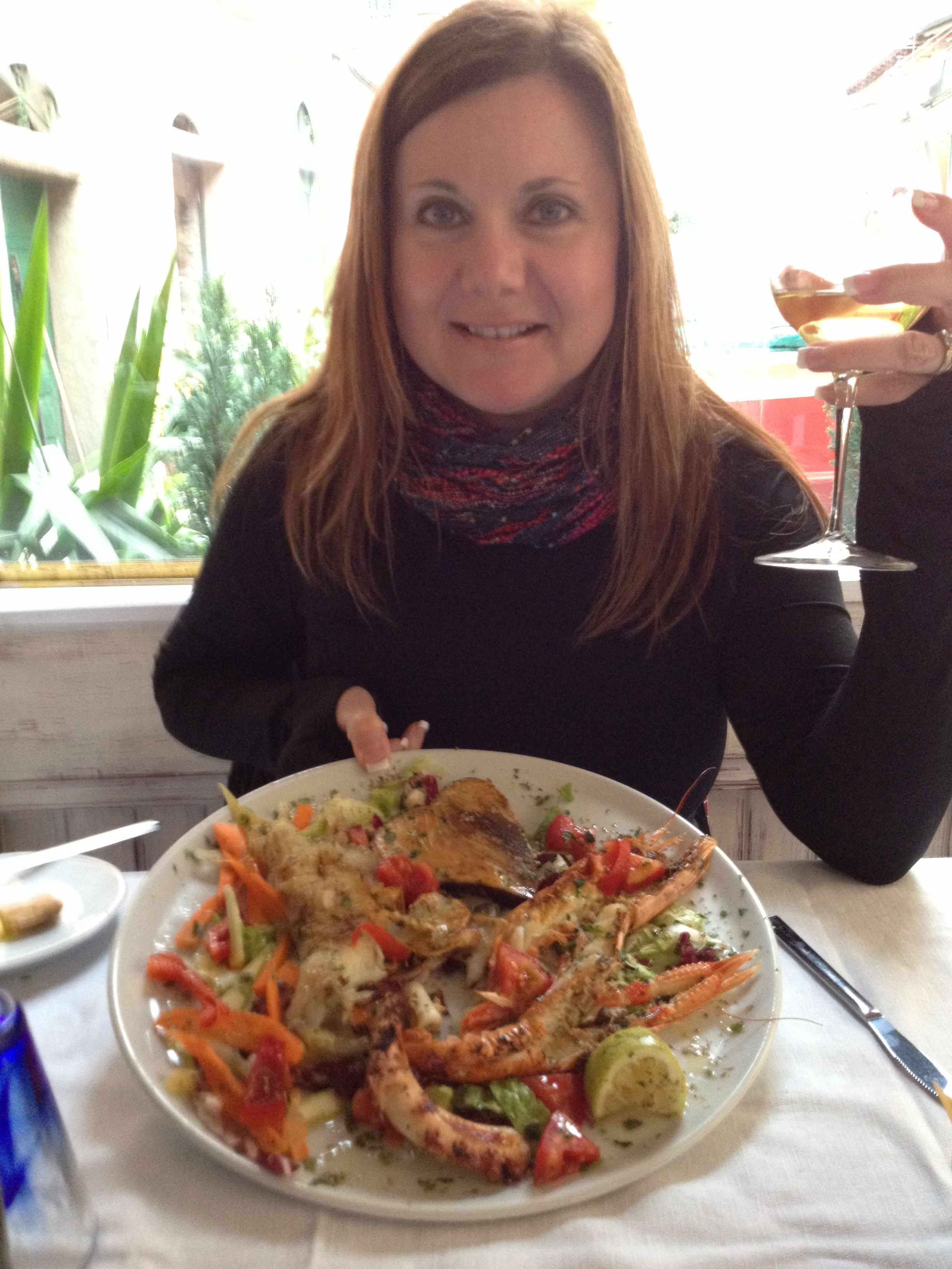 I ordered the fresh sardines for an appetizer, having read beforehand that this is a specialty of this region, and I got a mixed grill for my main dish. Everything was fantastic. The sardines were fresh and “non-fishy”, with a hint of lemon, and the mixed grill was amazing (lobster, prawns, octopus), other than one type of fish that I think our waiter said was known locally as the “chicken-fish”. Stay away from the chicken-fish. It was slightly mushy and tasteless. But everything else was primo.