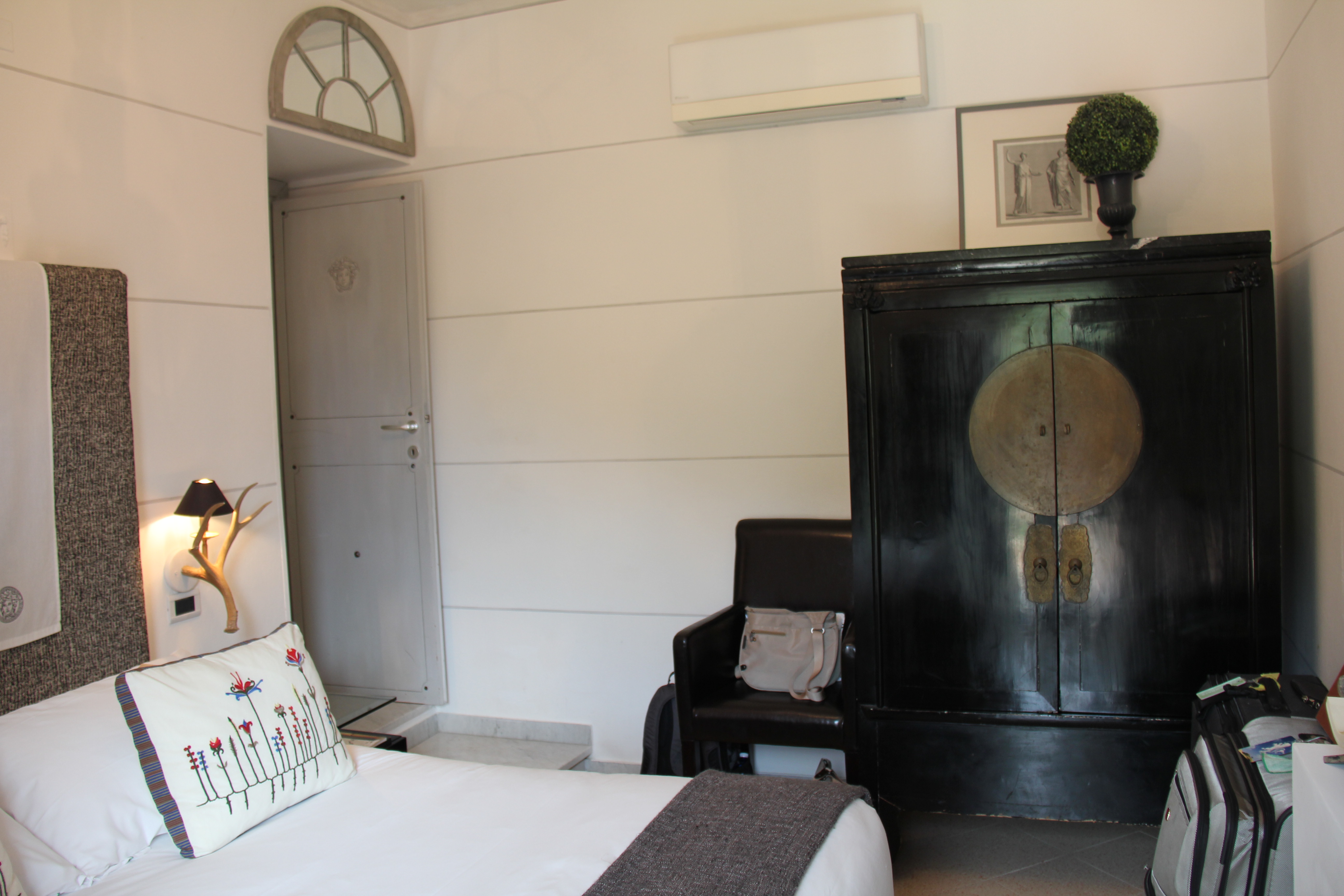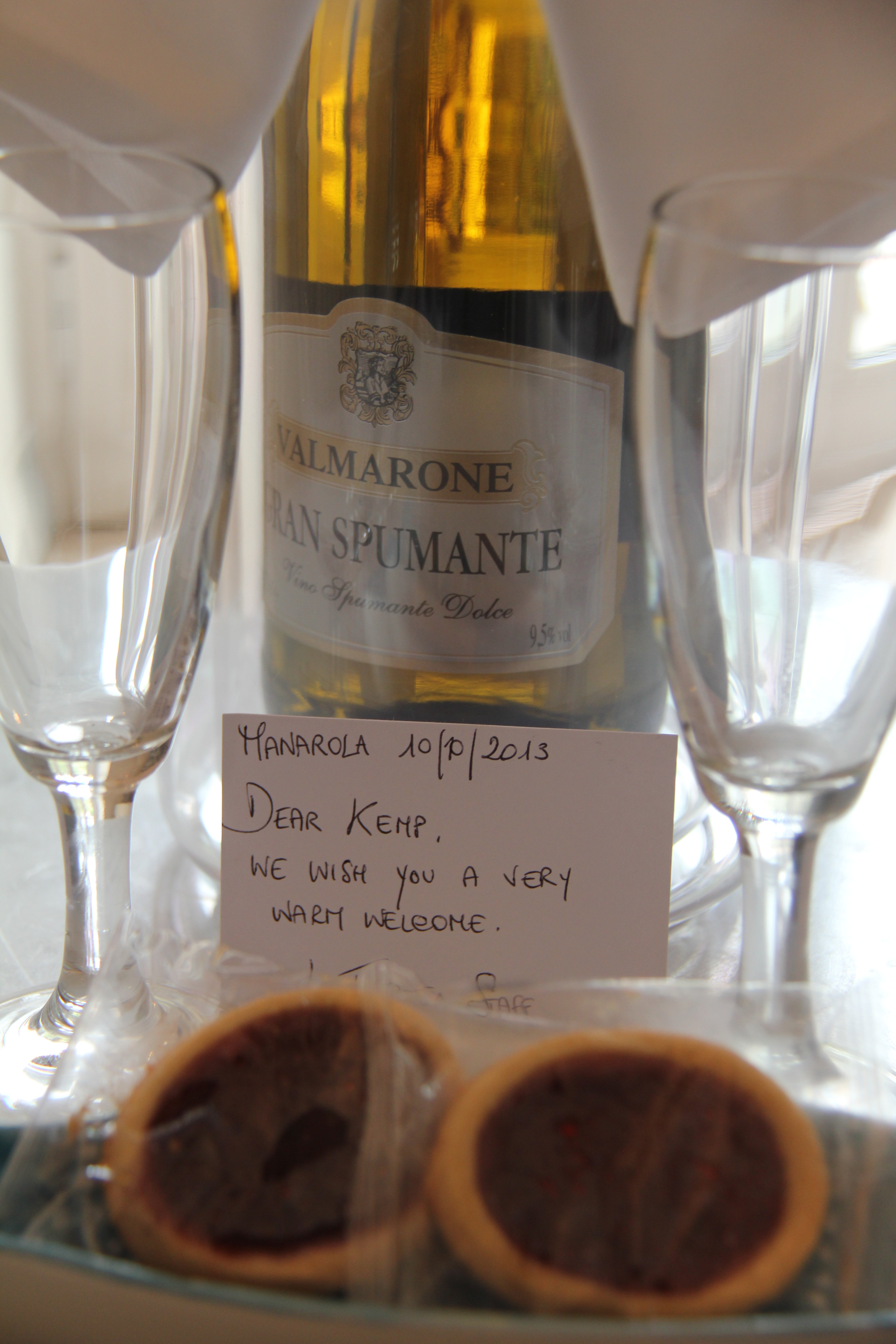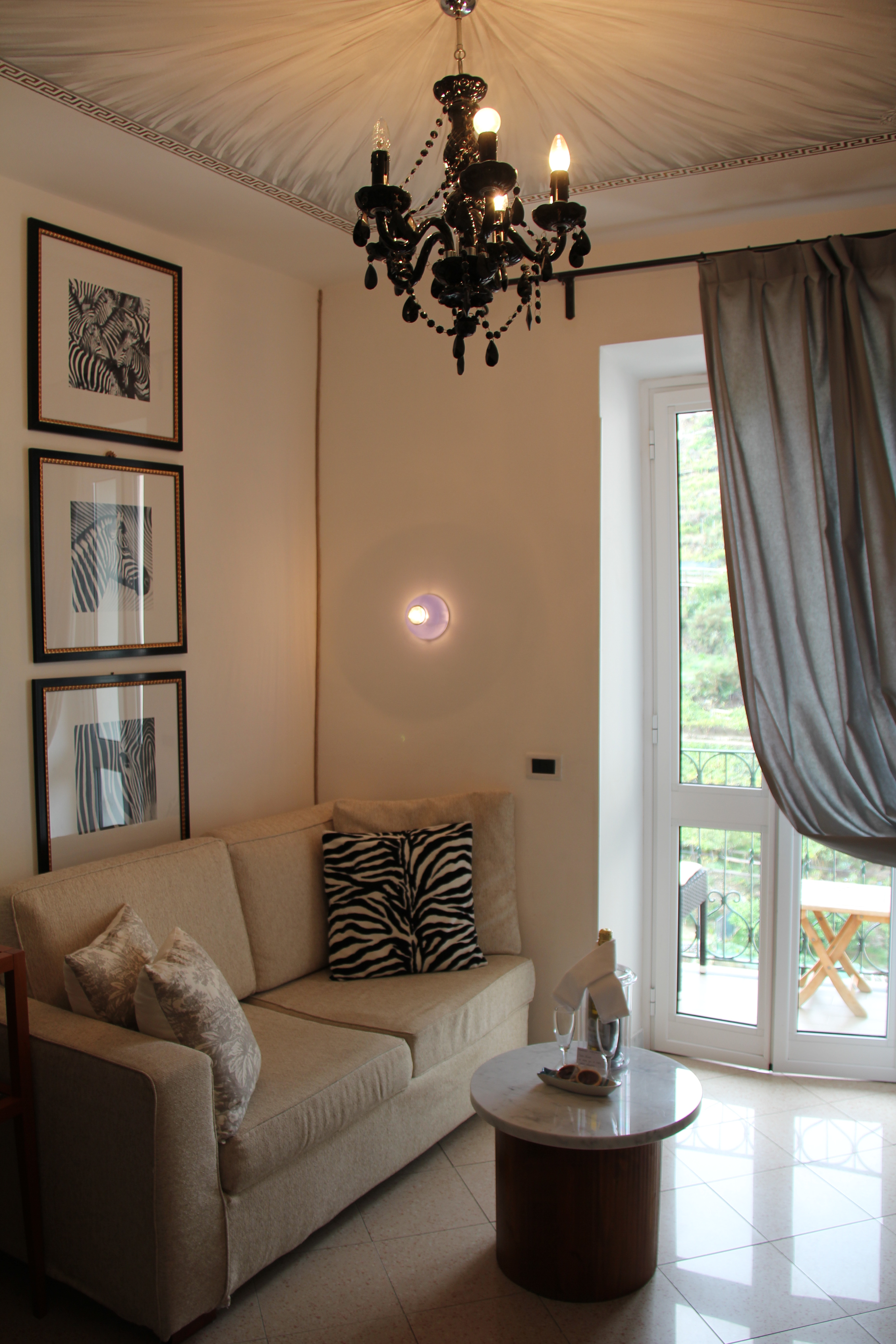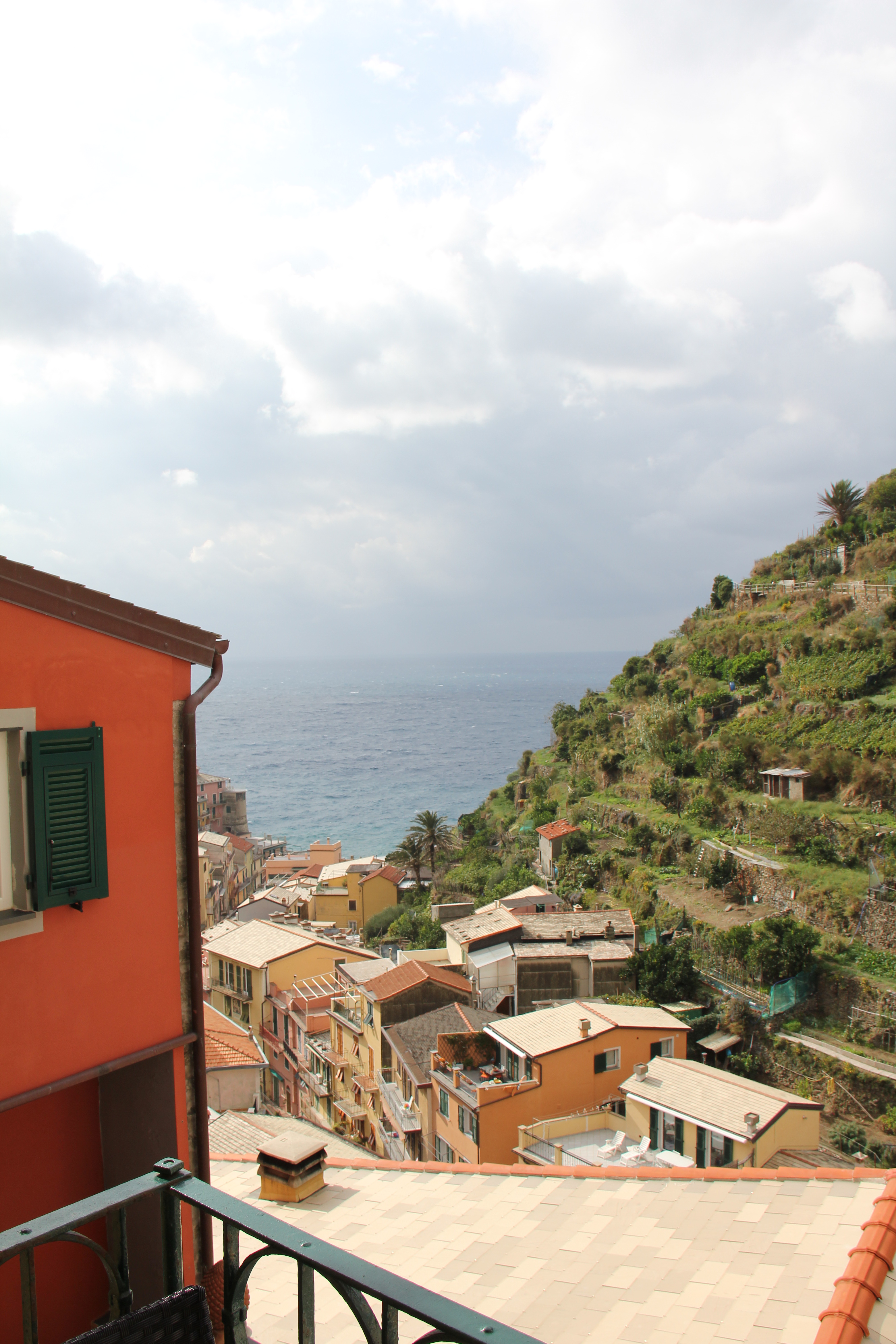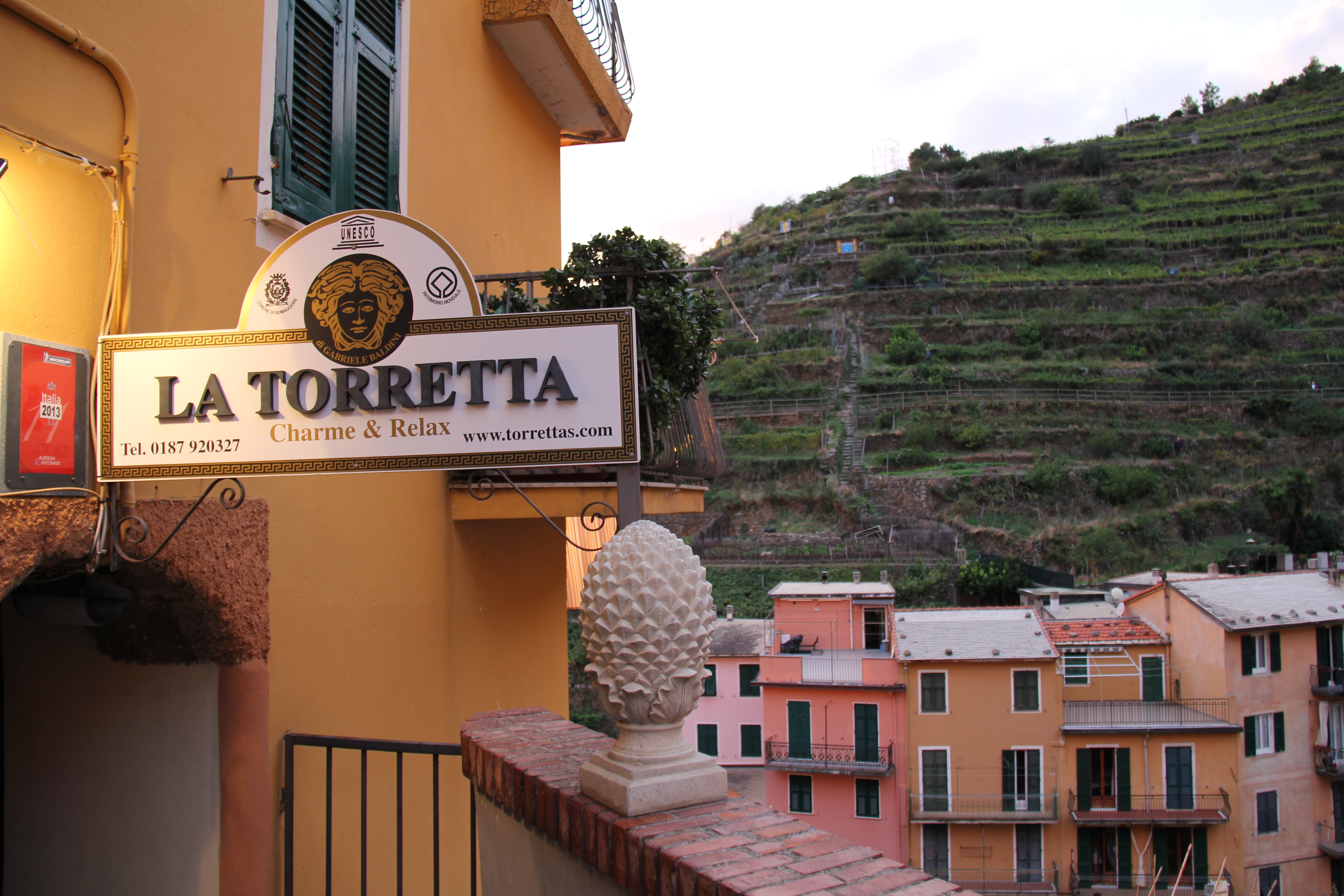 Our hotel in Cinque Terre was easily the most modern of all the hotels that we’d been to so far on the trip. It was more of a bed and breakfast, really, than a hotel, per se. Located at the top end of the village, the La Torretta B & B is perched with a view of the harbor below and the terraced vineyards directly across the way. Our very modern suite consisted of the bedroom, a sitting area with a balcony, and of course a bathroom.