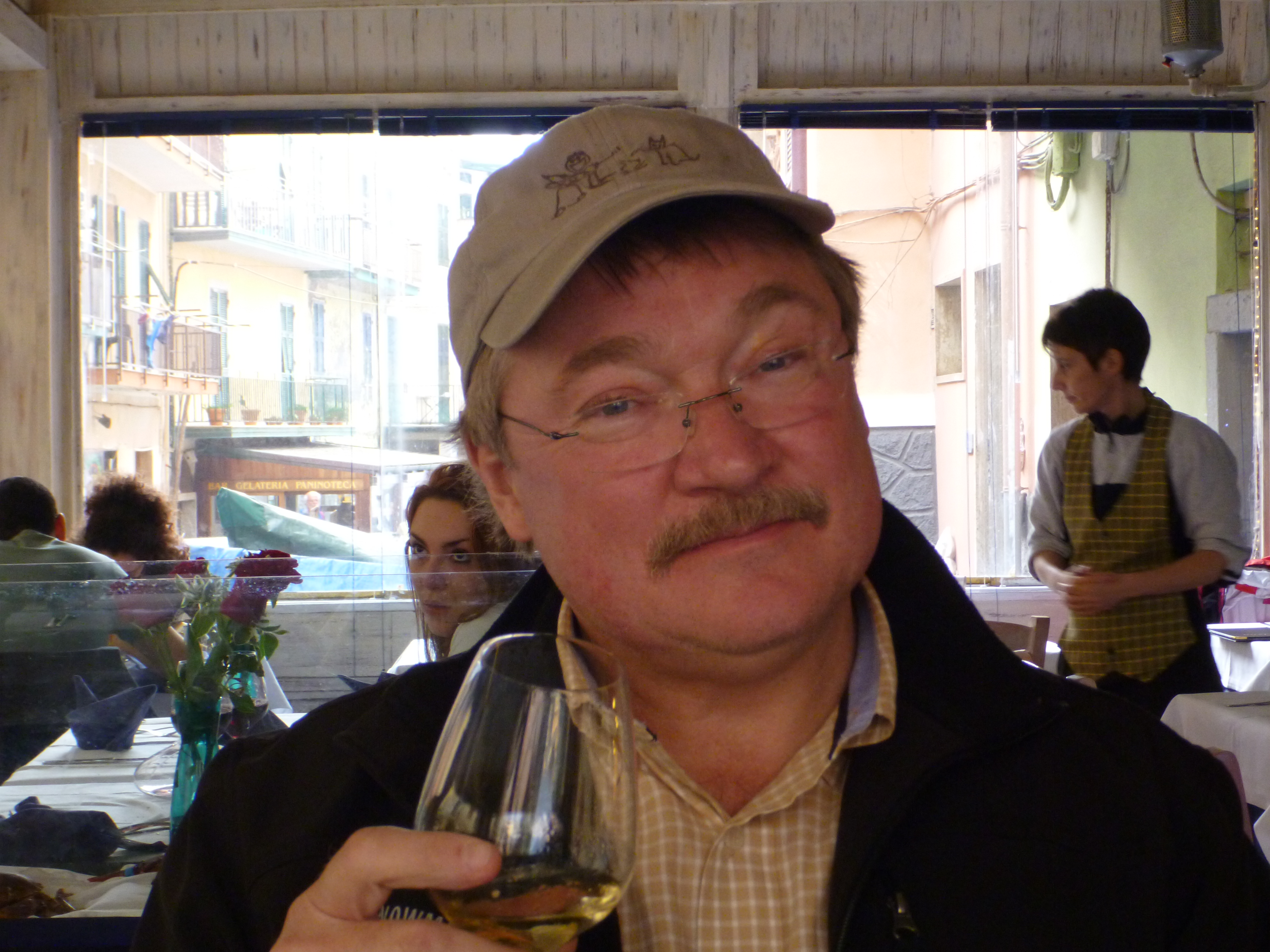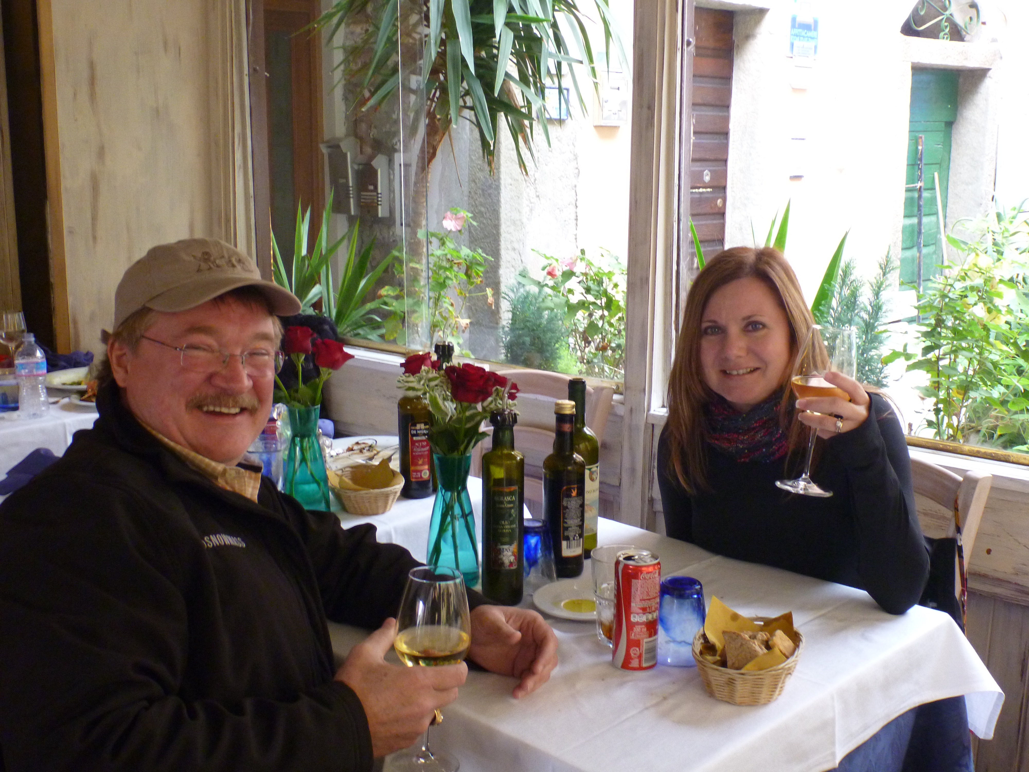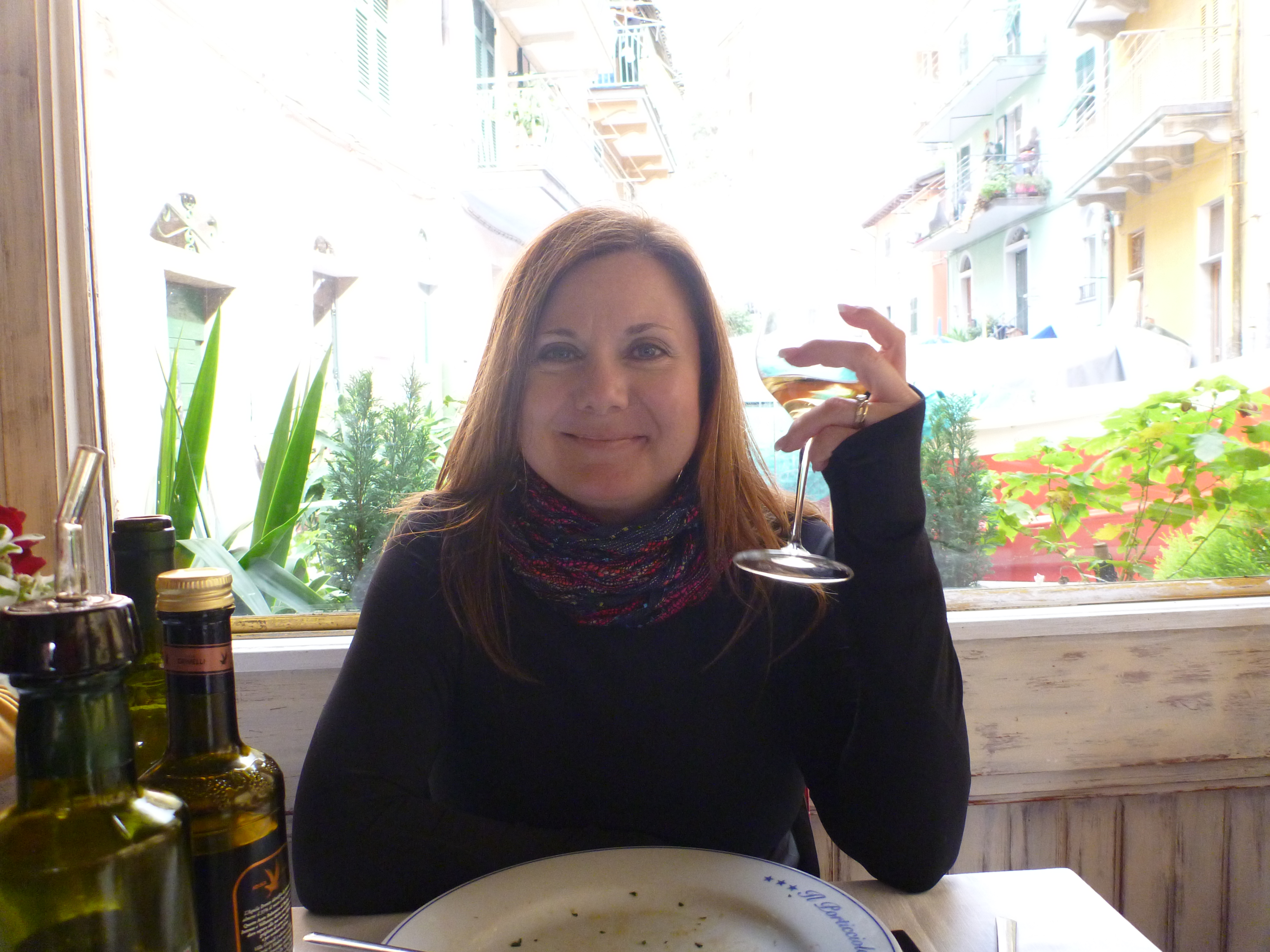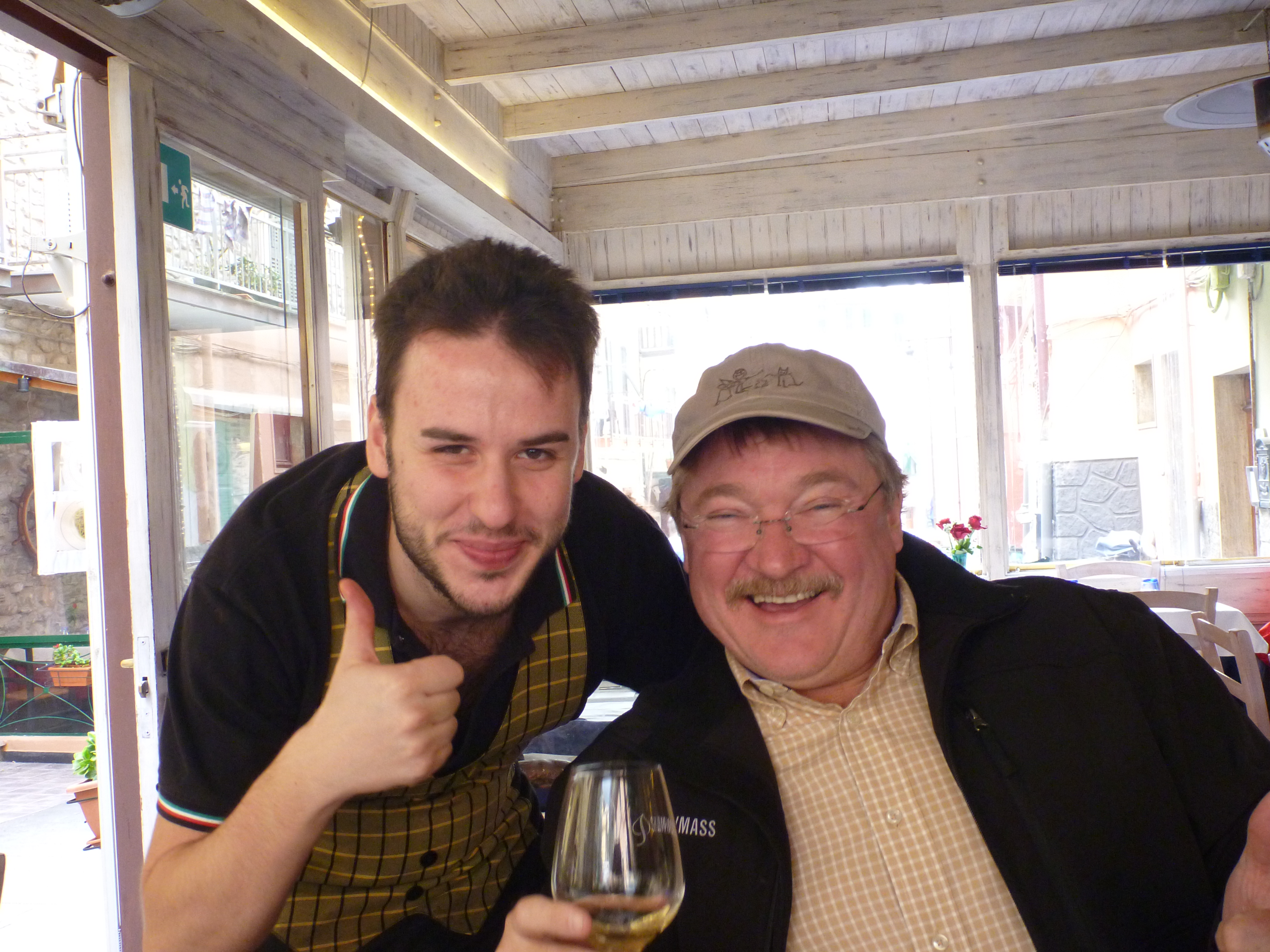 Now admittedly, on my other blog posts I’ve mentioned that this town or that town was “steep” or “hilly”. Pshaw. These were child’s play compared to the steep streets of the Cinque Terre. My best advice to you if you’re ever considering a trip there: wear sensible shoes. With visions of a rolling snowball in our minds, we carefully picked our way along the street from the main piazza above the harbor, down to the harbor area itself. The street along the way was lined with shops and restaurants. When we were just about at the bottom, we noticed a restaurant with the Rick Steve’s emblem on the window, and so we felt safe stopping in.